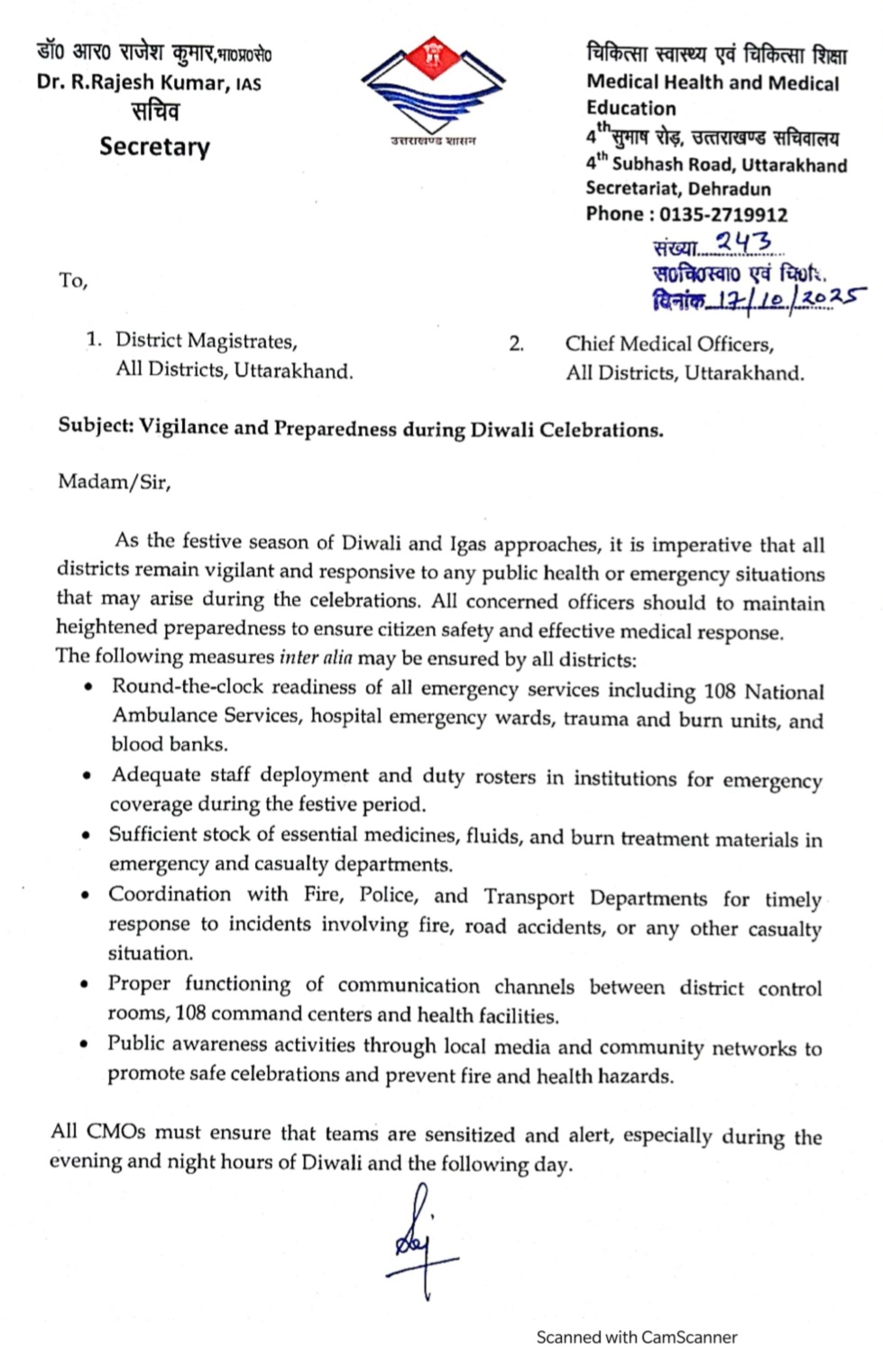 - सचिव डॉ. आर. राजेश कुमार ने दिए सभी जिलाधिकारियों और सीएमओ को 24×7 सतर्क रहने के निर्देश