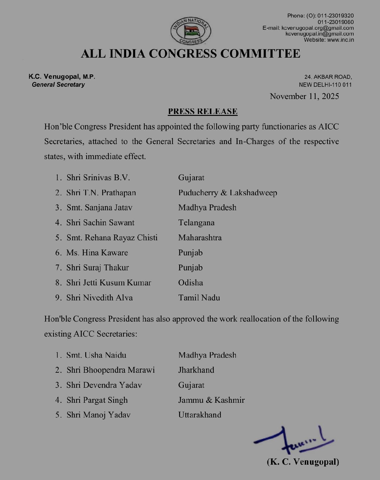कांग्रेस हाईकमान ने नियुक्तियां तत्काल प्रभाव से की लागू