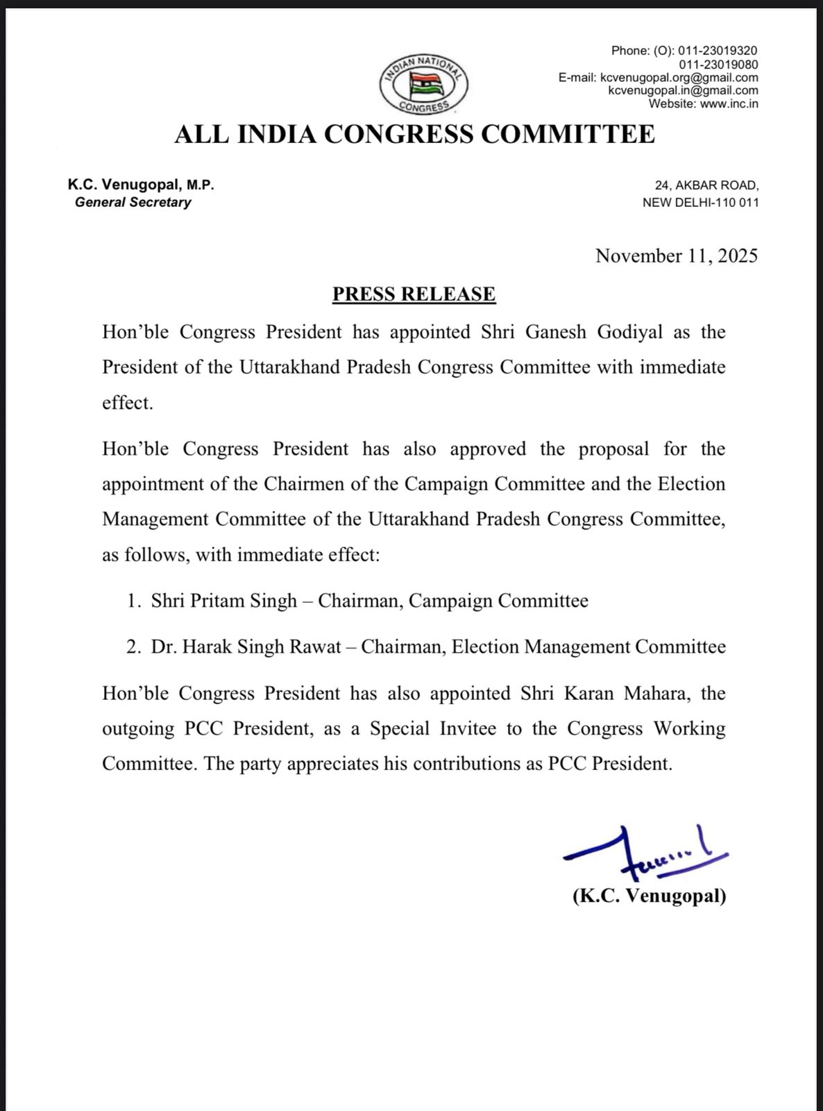 उत्तराखंड कांग्रेस को मिला नया कप्तान, गणेश गोदियाल को बड़ी जिम्मेदारी; बनाया प्रदेश कांग्रेस अध्यक्ष