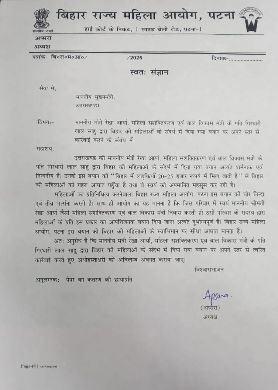 बिहार महिला आयोग ने उत्तराखंड के मुख्यमंत्री को क्यों लिखा पत्र? इस मंत्री के पति के बयान पर कार्रवाई की मांग