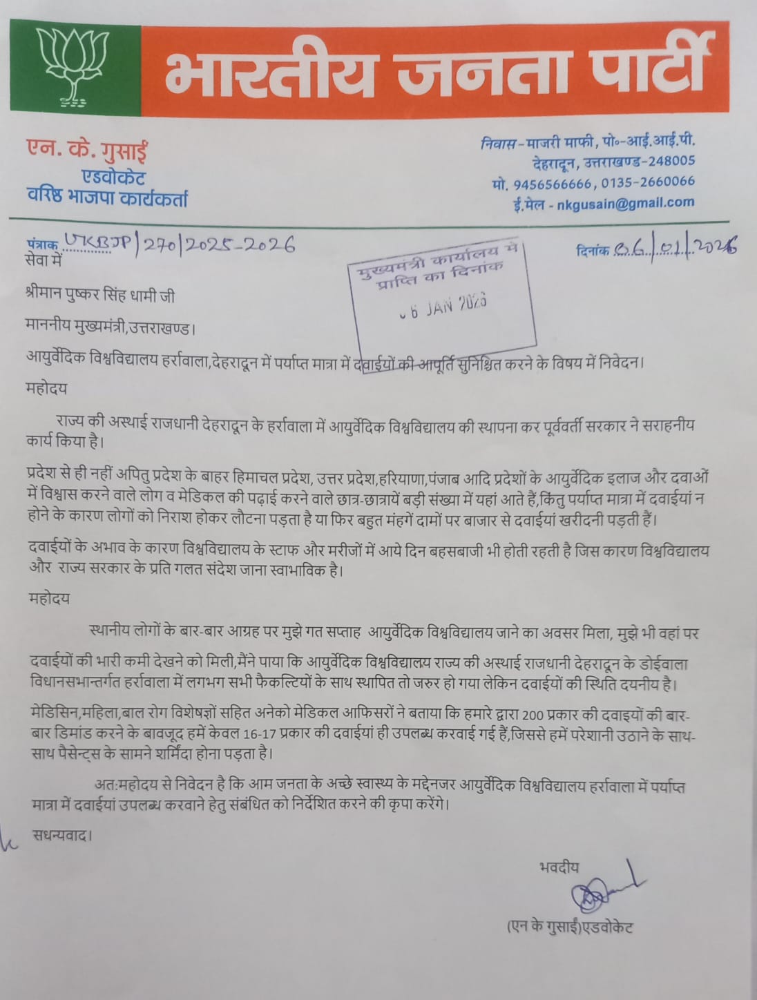 भाजपा नेता ने मुख्यमंत्री धामी से अपील की कि आम जनता के अच्छे स्वास्थ्य के मद्देनजर आयुर्वेदिक विश्वविद्यालय हर्रावाला में पर्याप्त मात्रा में दवाईयां उपलब्ध करवाने हेतु संबंधित को निर्देशित करने की कृपा करें।