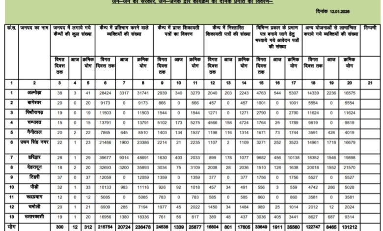 देहरादून, ब्यूरो। उत्तराखंड के मुख्यमंत्री पुष्कर सिंह धामी के नेतृत्व में राज्य सरकार द्वारा संचालित “जन–जन की सरकार, जन–जन के द्वार” कार्यक्रम के अंतर्गत प्रदेशभर में जनसेवा को प्रभावी, पारदर्शी एवं सुलभ बनाने की दिशा में निरंतर ठोस प्रगति दर्ज की जा रही है। कार्यक्रम की 12 जनवरी 2026 तक की दैनिक प्रगति रिपोर्ट इस बात का प्रमाण है कि सरकार जनता की समस्याओं के समाधान हेतु पूरी प्रतिबद्धता के साथ धरातल पर कार्य कर रही है।
