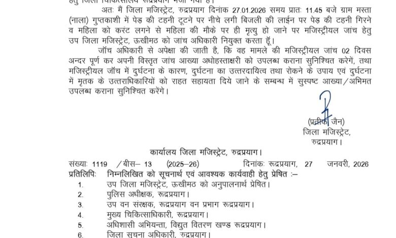 इस गंभीर घटना का संज्ञान लेते हुए जिला मजिस्ट्रेट रुद्रप्रयाग प्रतीक जैन ने मामले में मजिस्ट्रियल जांच के आदेश जारी किए हैं। जिलाधिकारी द्वारा दिनांक 27.01.2026 को प्रातः 11:45 बजे हुए इस प्रकरण की मजिस्ट्रियल जांच हेतु उप जिला मजिस्ट्रेट, ऊखीमठ को जांच अधिकारी नियुक्त किया गया है।