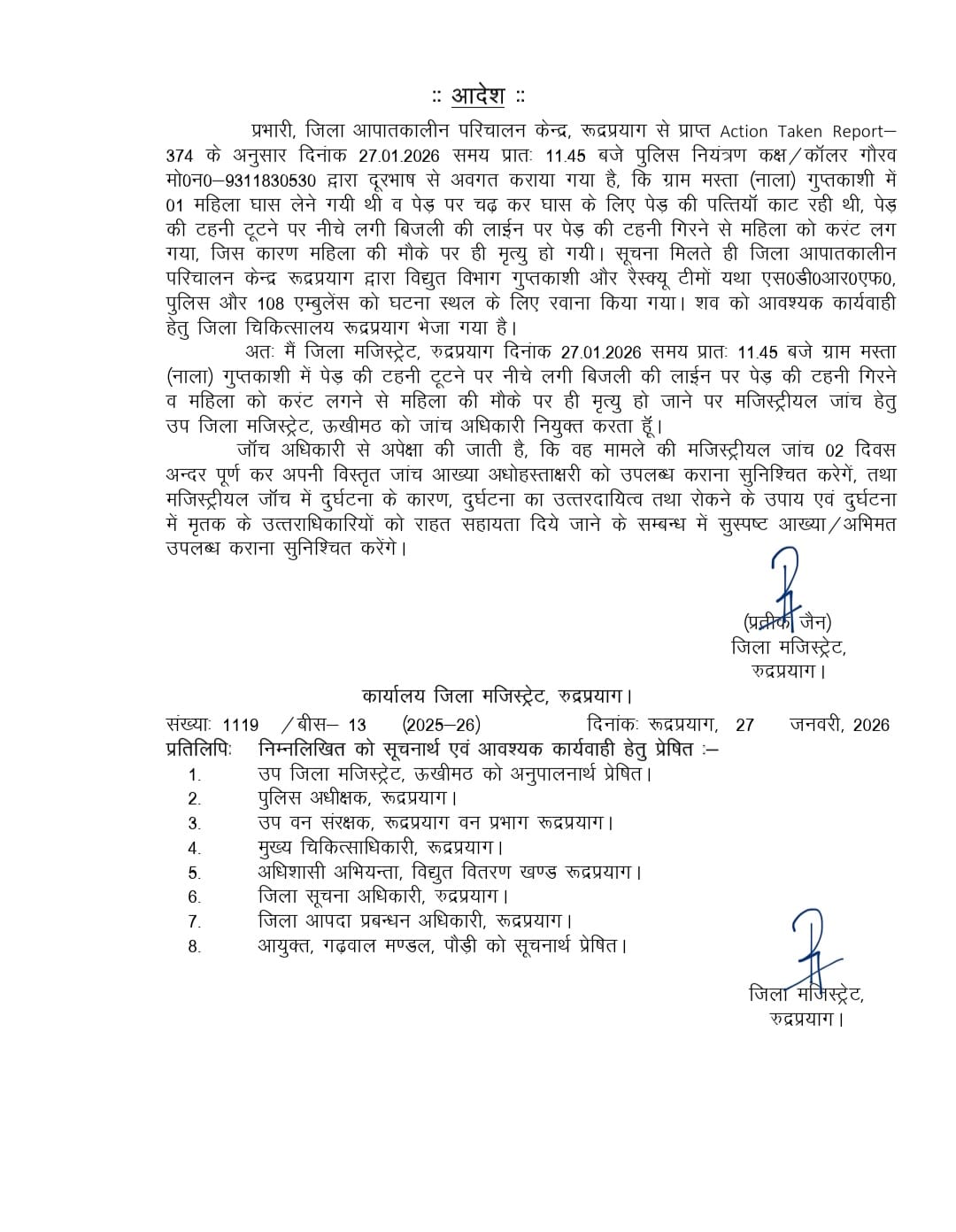 गुप्तकाशी के ग्राम मस्ता (नाला) में महिला की करंट लगने से हुई मृत्यु पर DM प्रतीक जैन ने मजिस्ट्रियल जांच के दिए आदेश